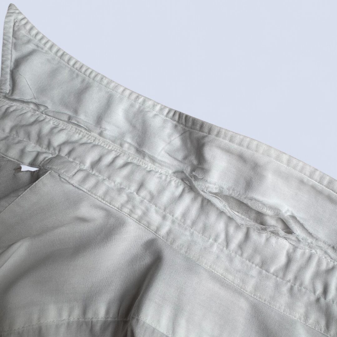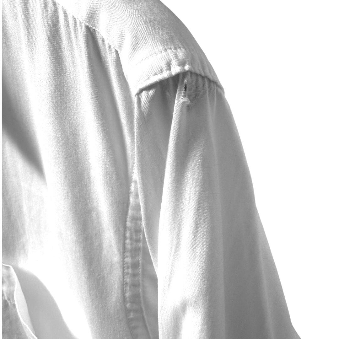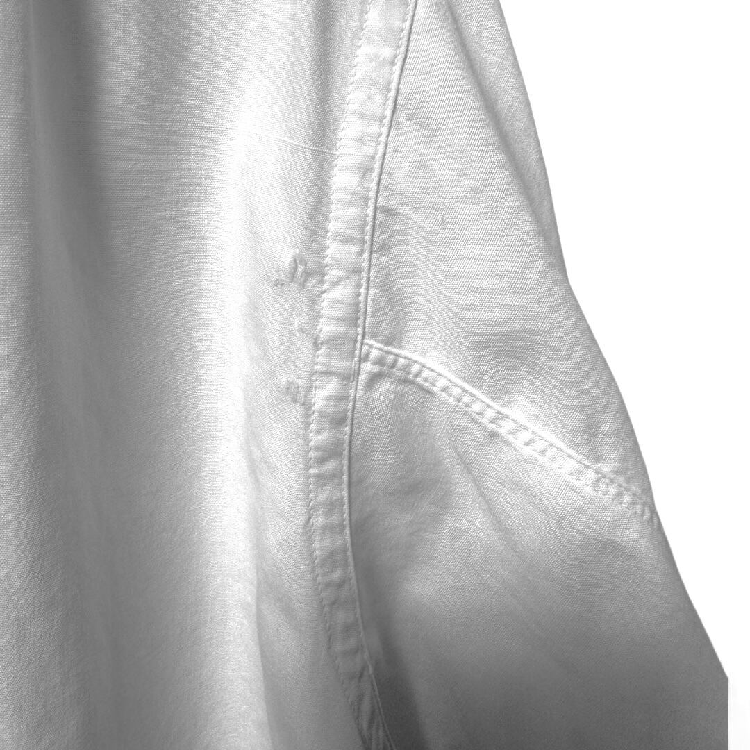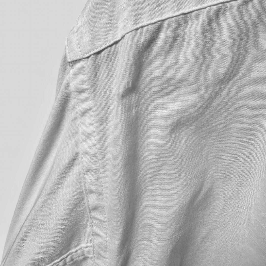襟周りの生地(内側,外側)の破れ、台襟部分の穴空き、左袖肘下部分に生地の破れ、カフス部分の若干の解け、その全体的に生地が薄手の為小傷などがございます