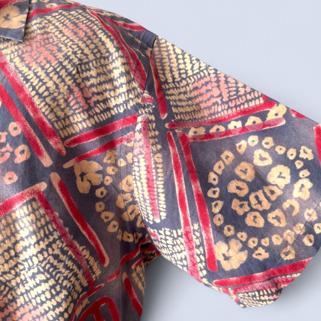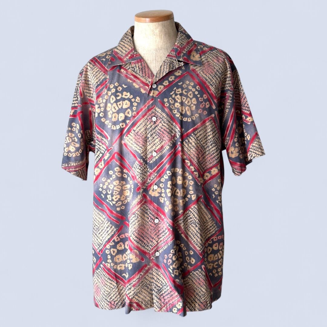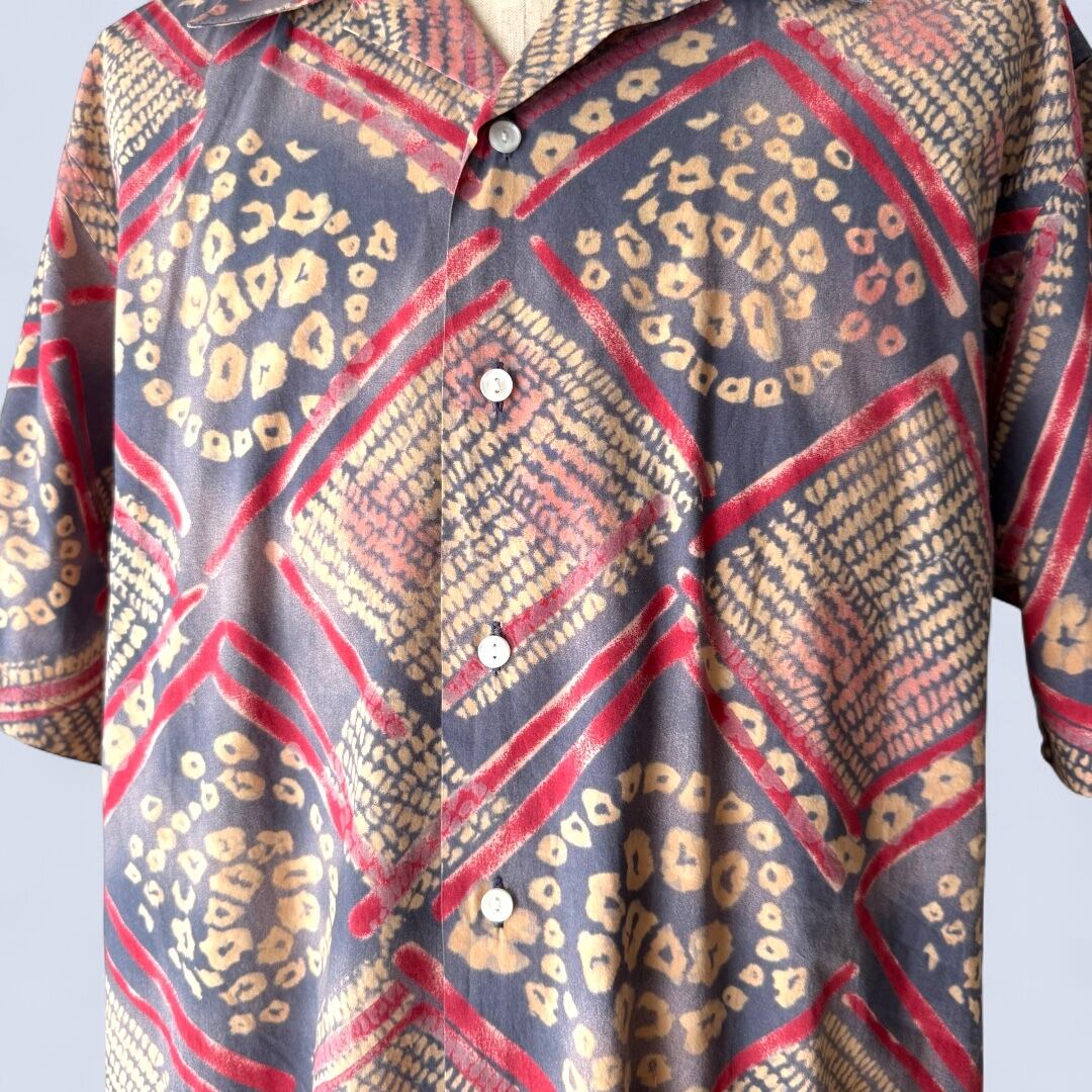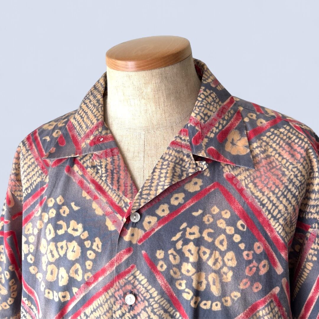 オープンカラーにボックスシルエットというリラックスしたディテールを備え、当時のキャンプシャツやアートワークを意識した大胆なプリントが魅力です
