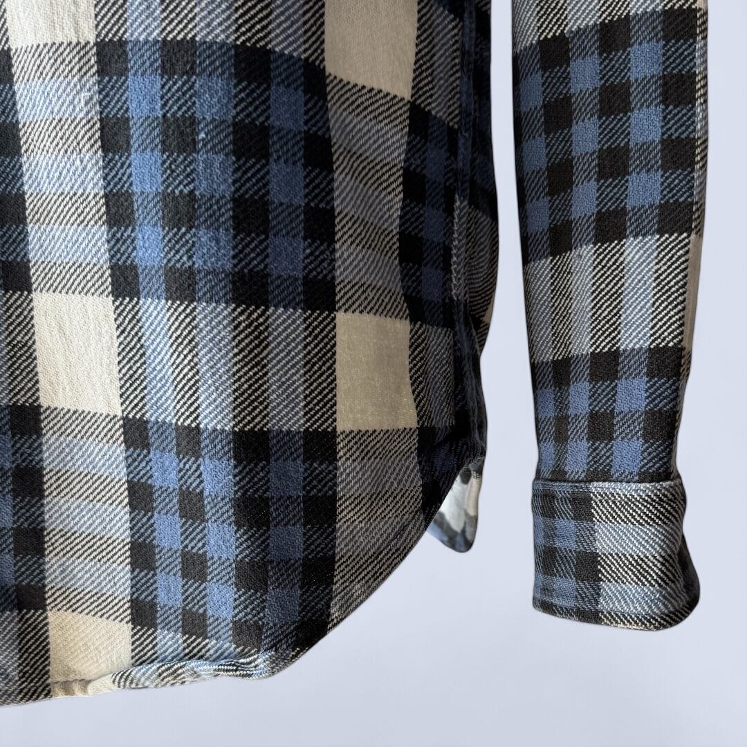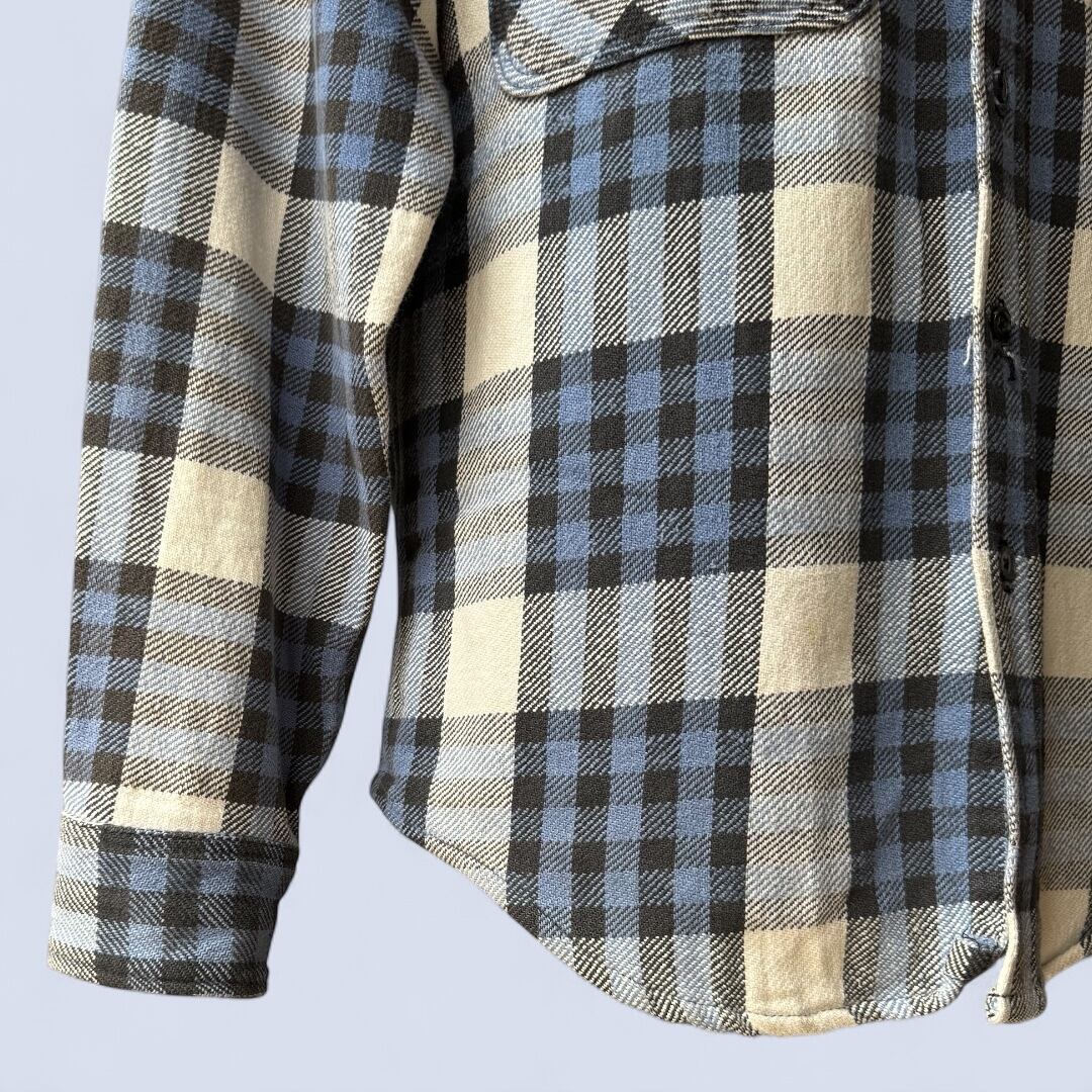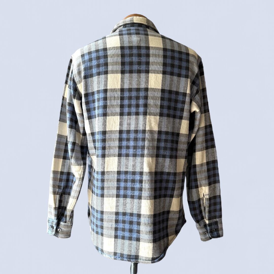 しっかりしたコットンフランネル生地と落ち着いたブルー×グレーの配色が特徴で、ワークシャツとしての実用性とファッション性を兼ね備えています