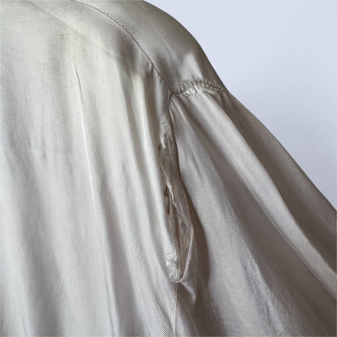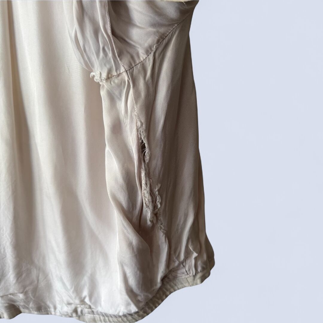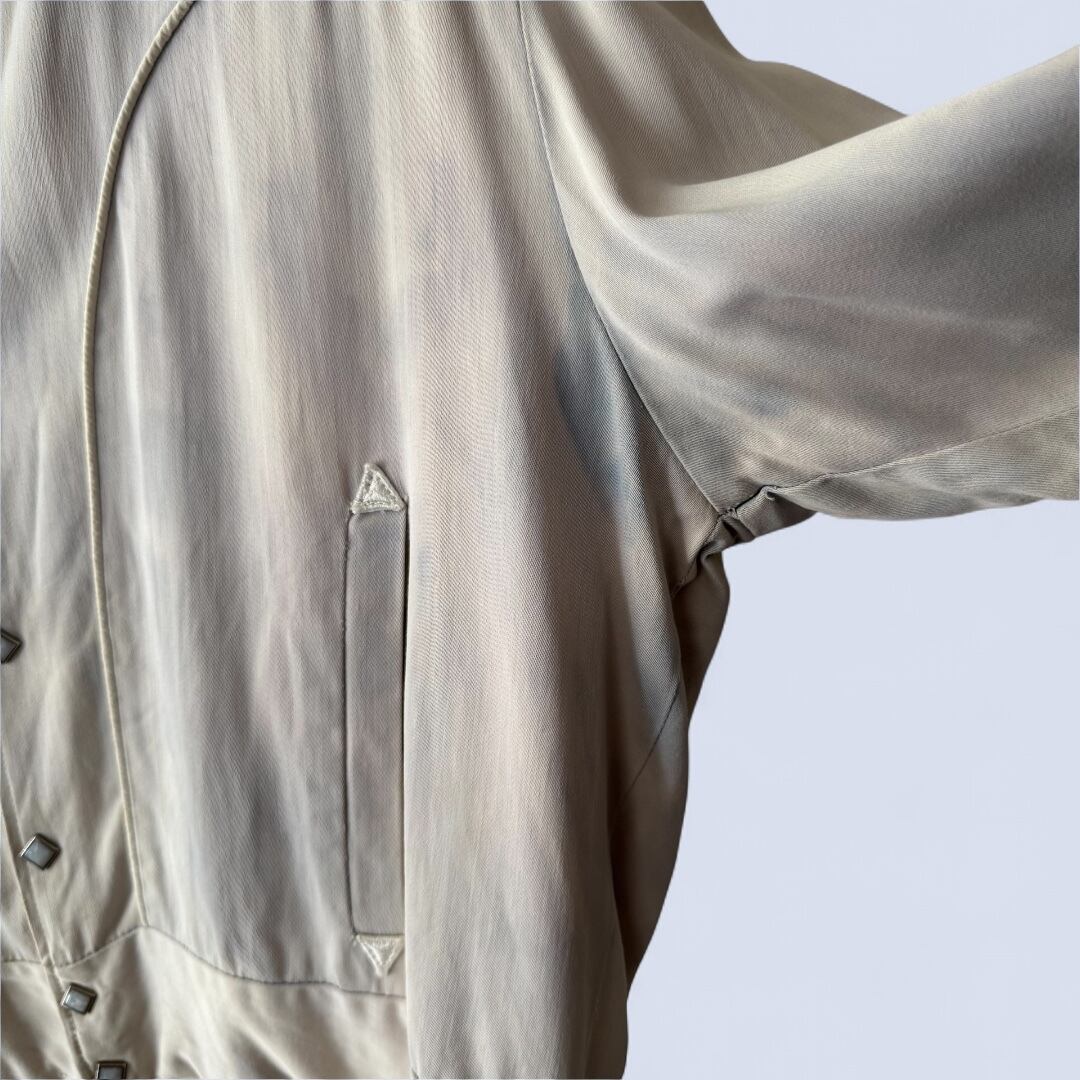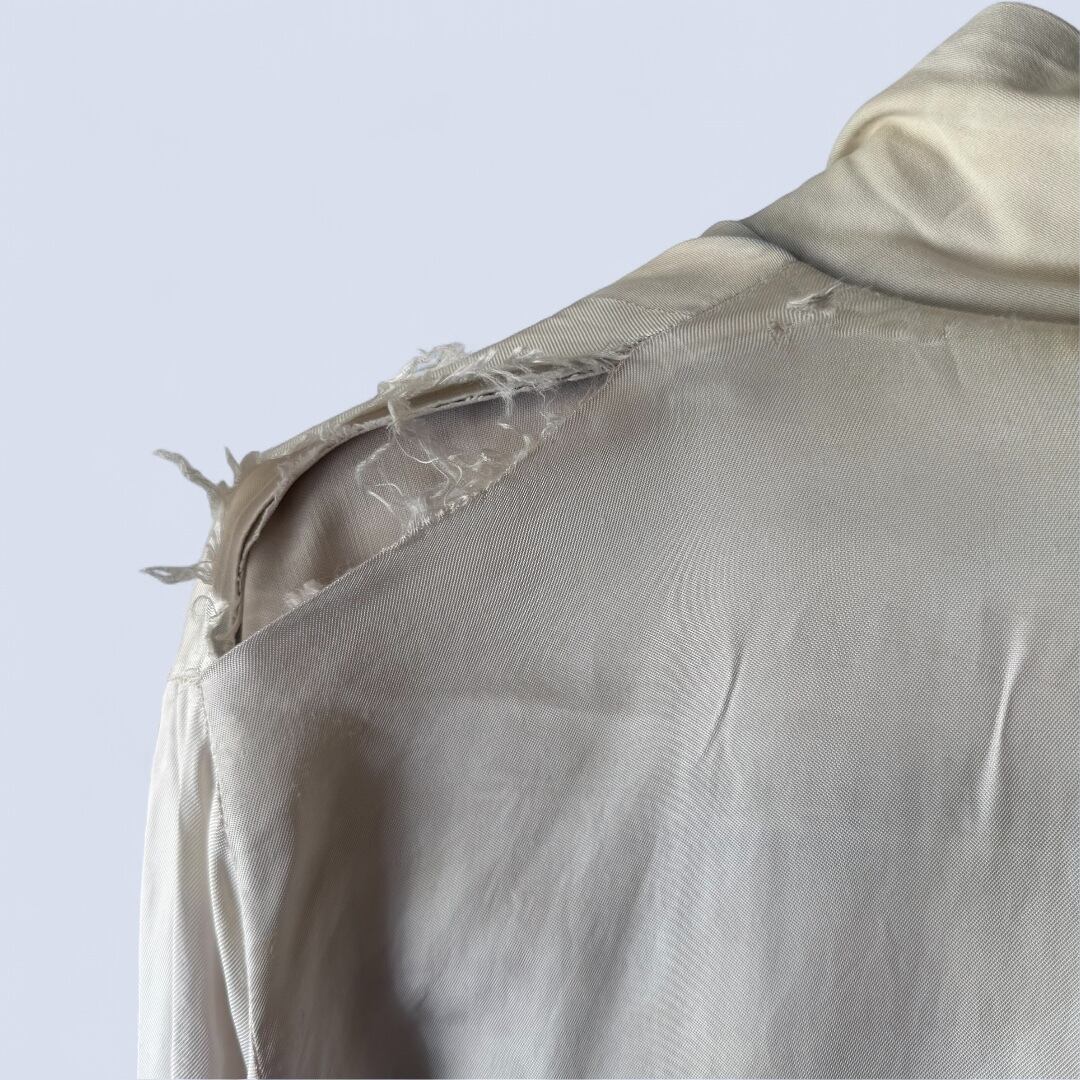 状態:経年によるブリーチ痕や色抜け、裏地の破れがございます。しかしながら、このブリーチのムラ感や擦れは、単なるダメージを超えて一点物のアートピースのような存在感を放っています