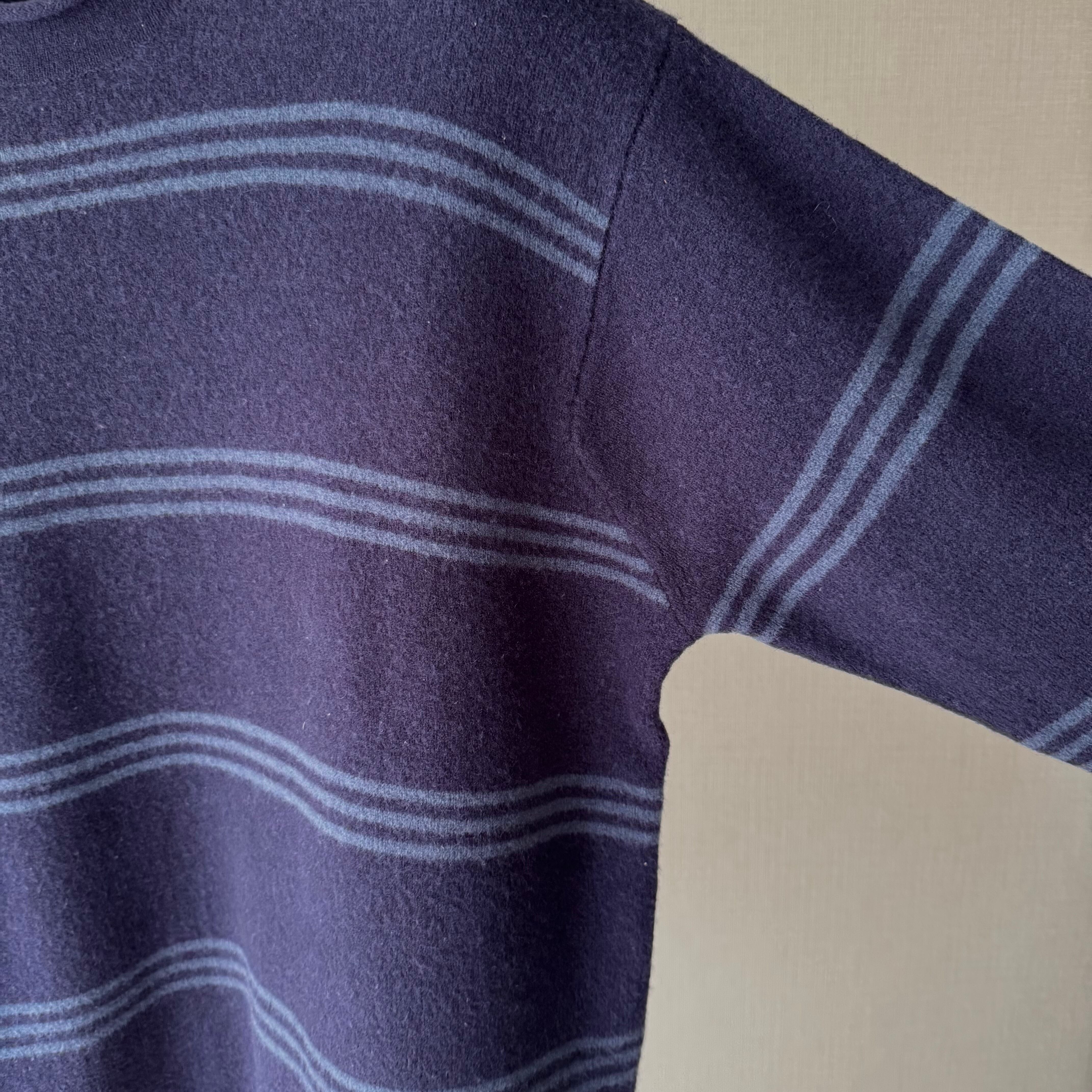 ロールネック仕様でネイビーボディに同系色のボーダーライン入り、落ち着いたトーン