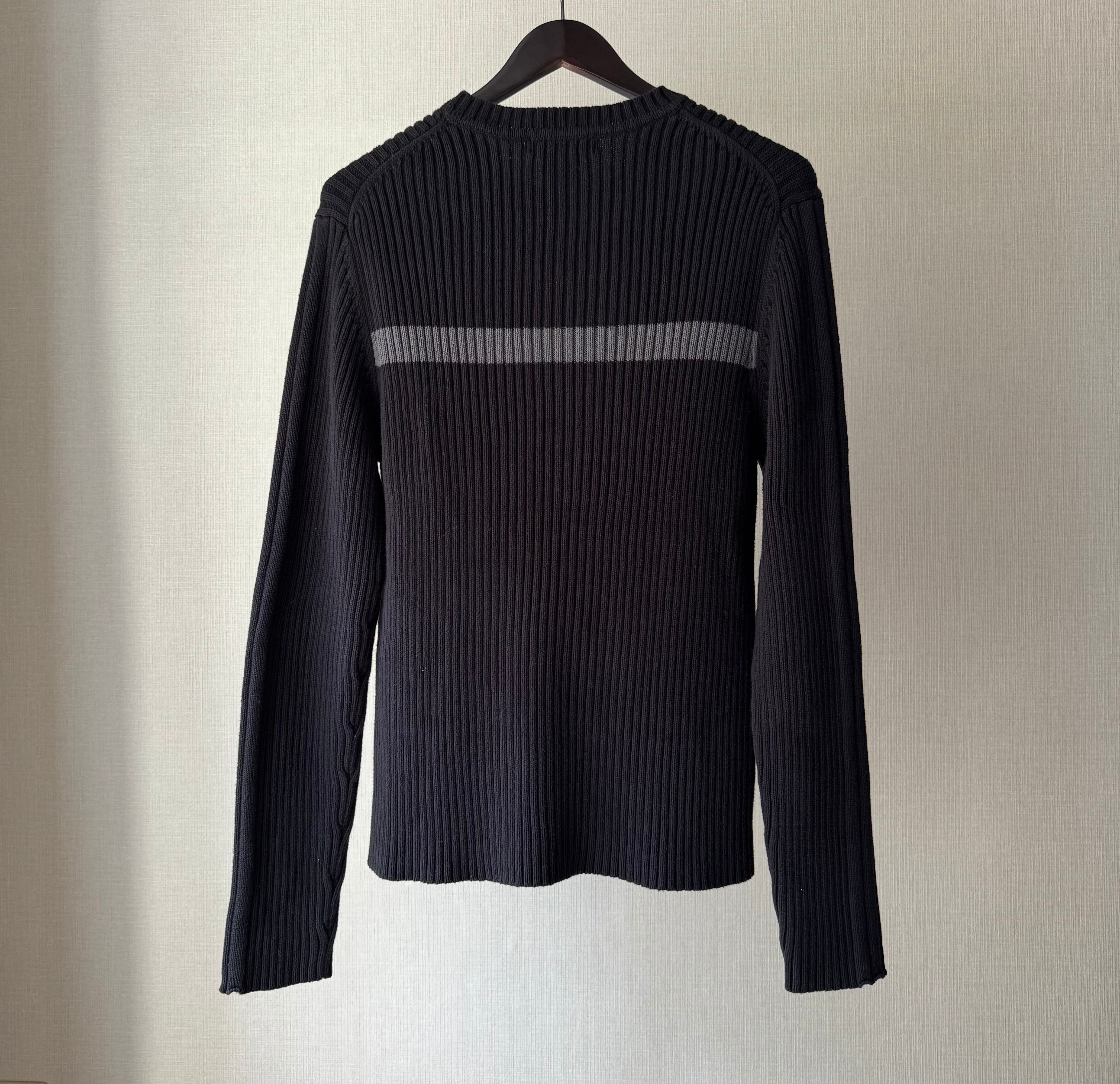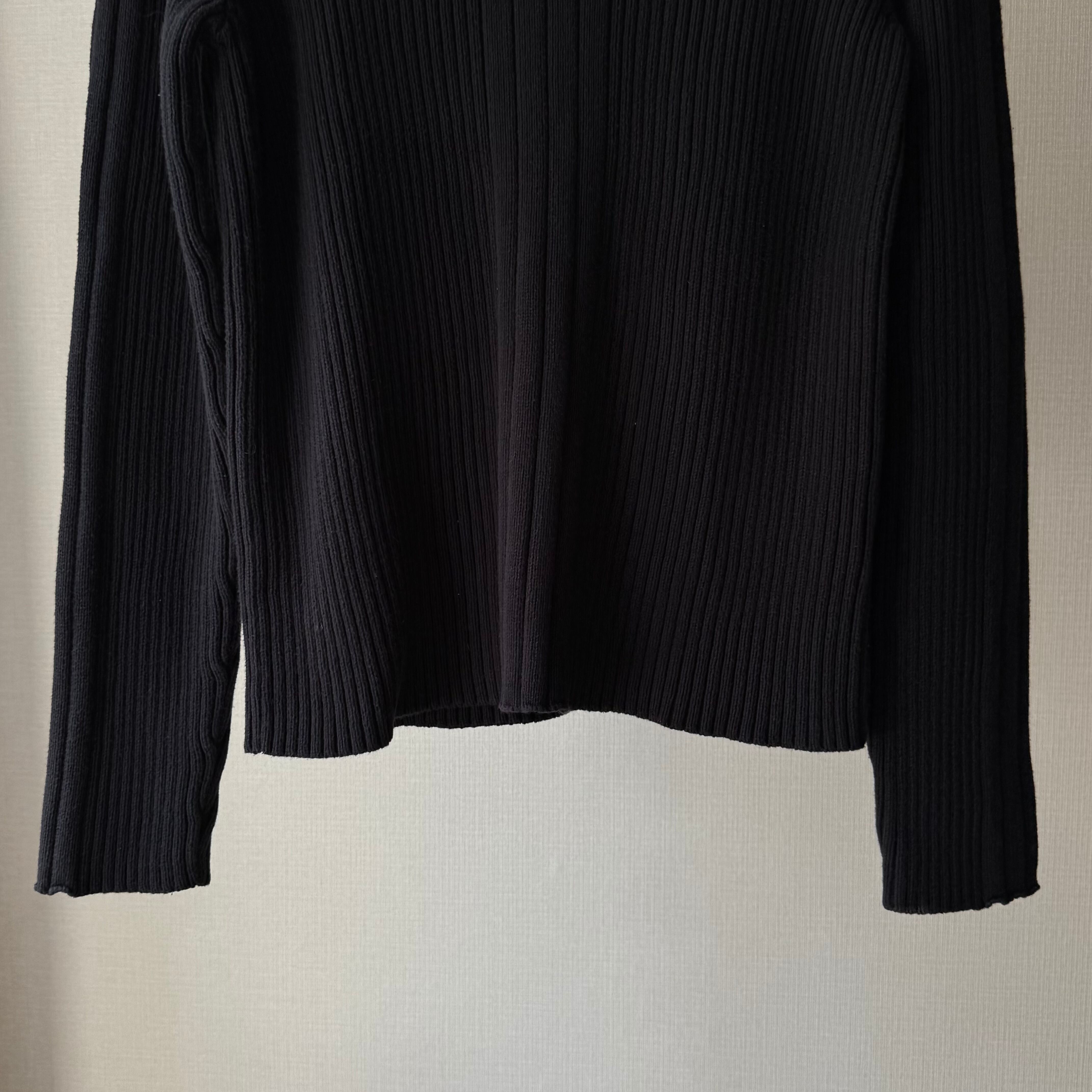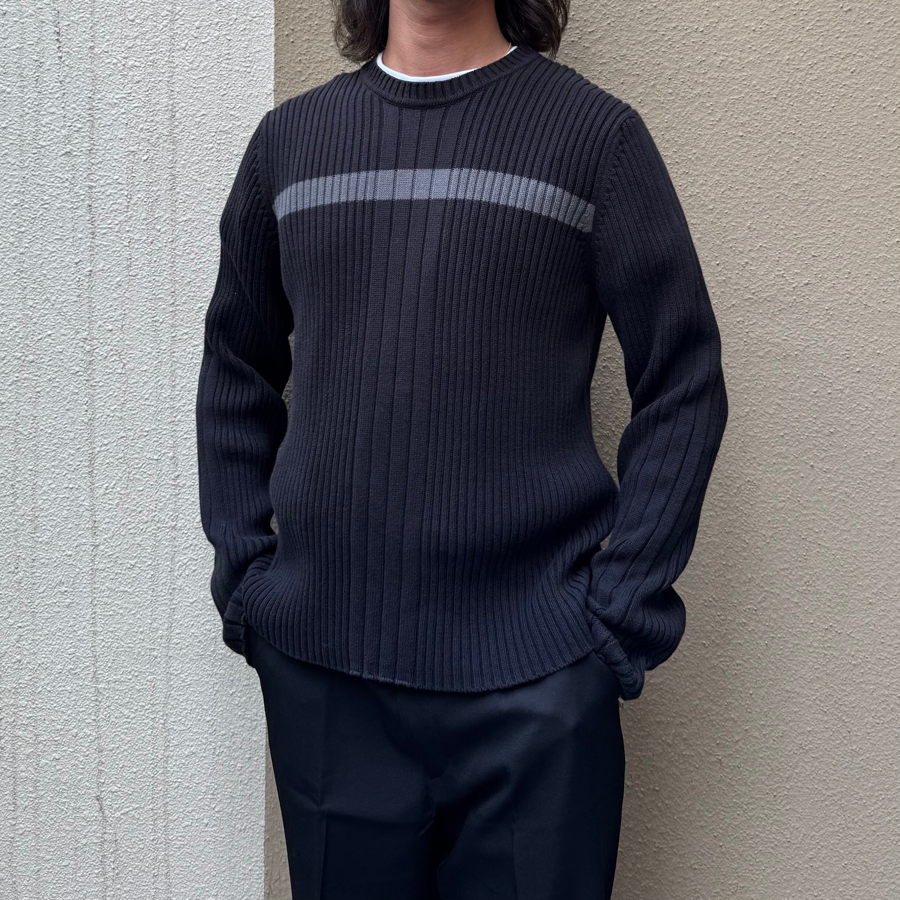 リブ編みの立体的な表情で胸元に切り替えのグレーラインが入り、シンプルながらモードな雰囲気