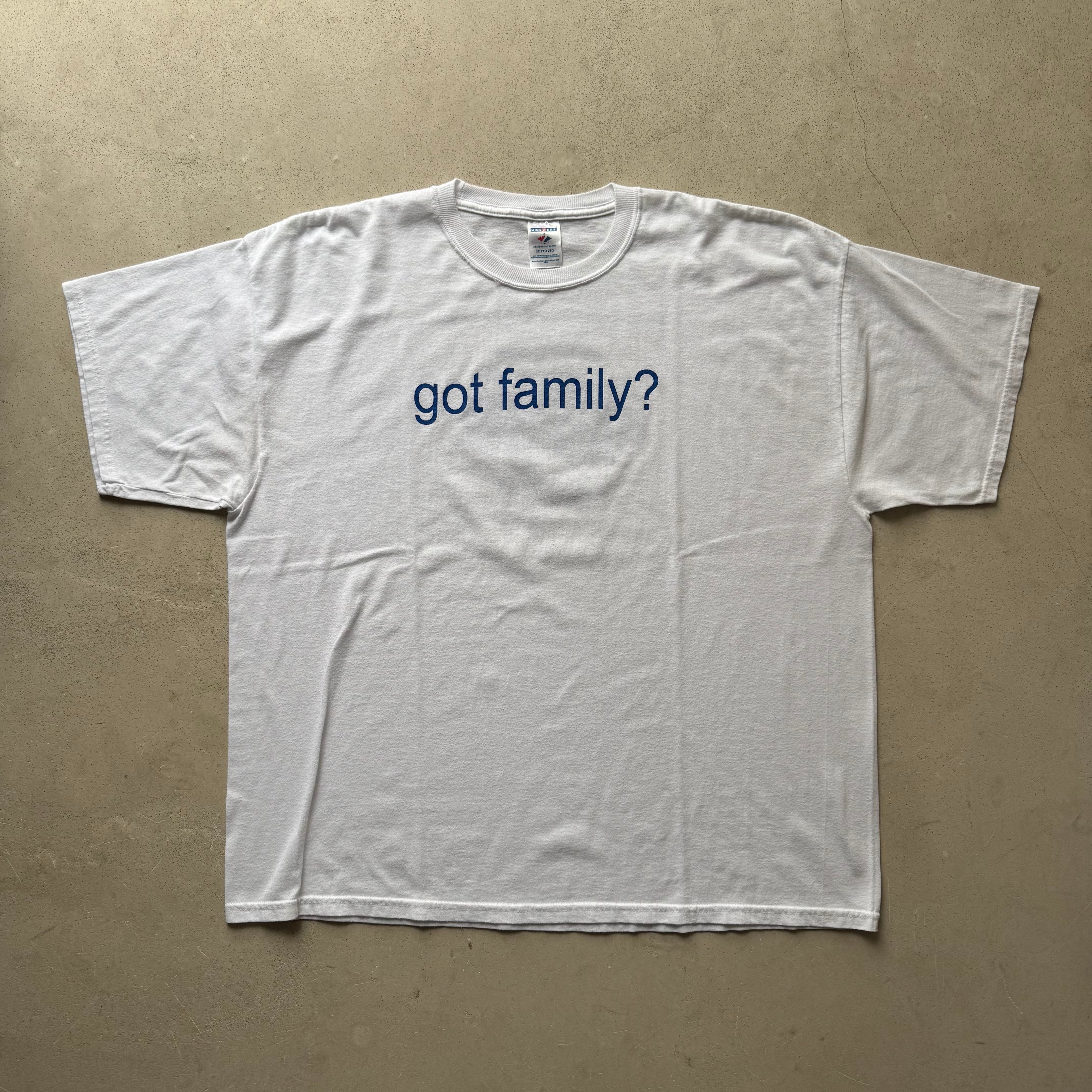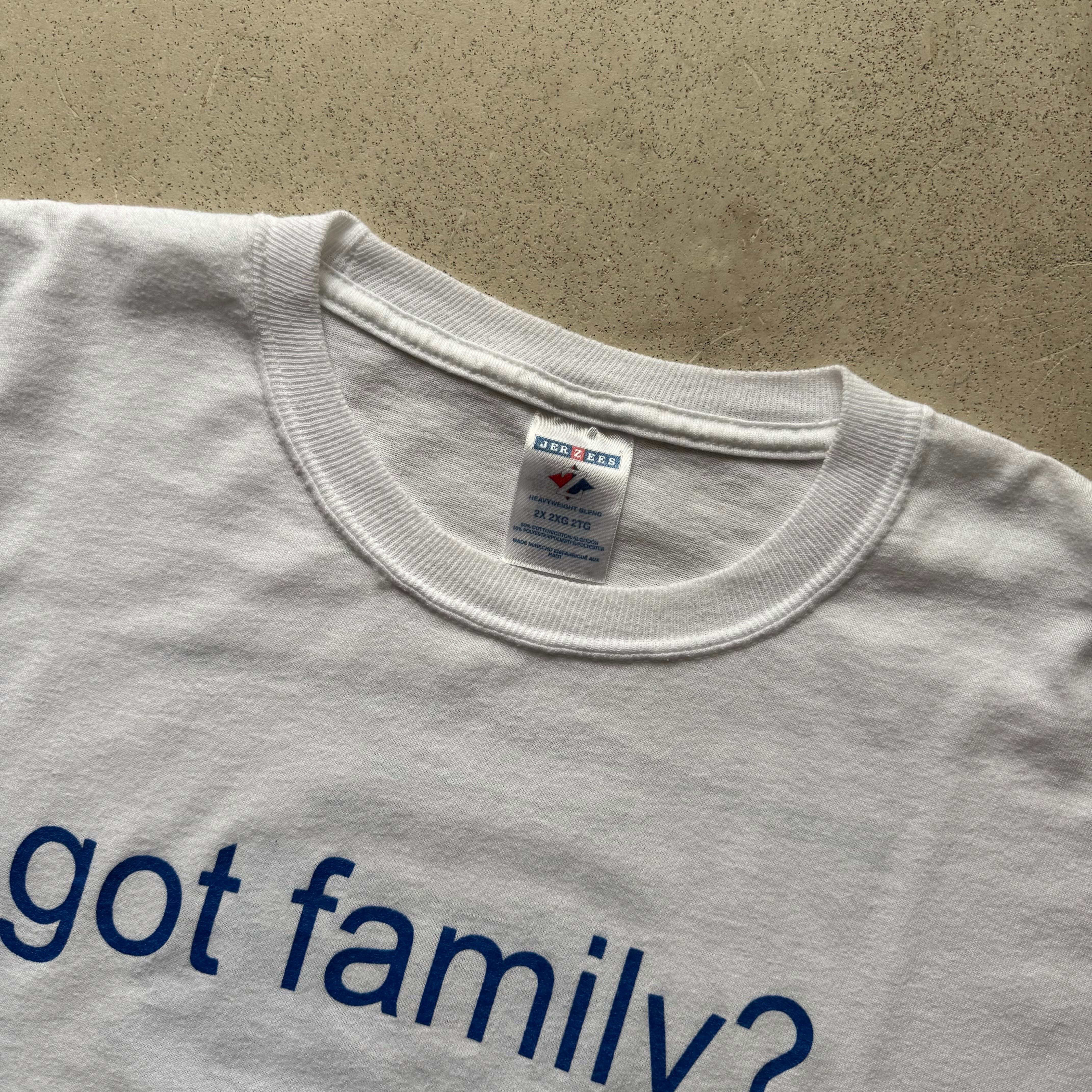 1990's ~ JERZEES "got family?" T-SHIRT ・ 50%COTTON 50%POLYESTER size:2XL 実寸:肩幅 61cm / 身幅 66cm / 着丈 73cm / 袖丈 20cm 状態詳細:襟リブに若干の解れと全体的に多少の毛羽立ちはございますがその他目立つダメージの見られないUSED CONDITIONです。 非常におすすめの逸品です この機会に是非ご検討ください