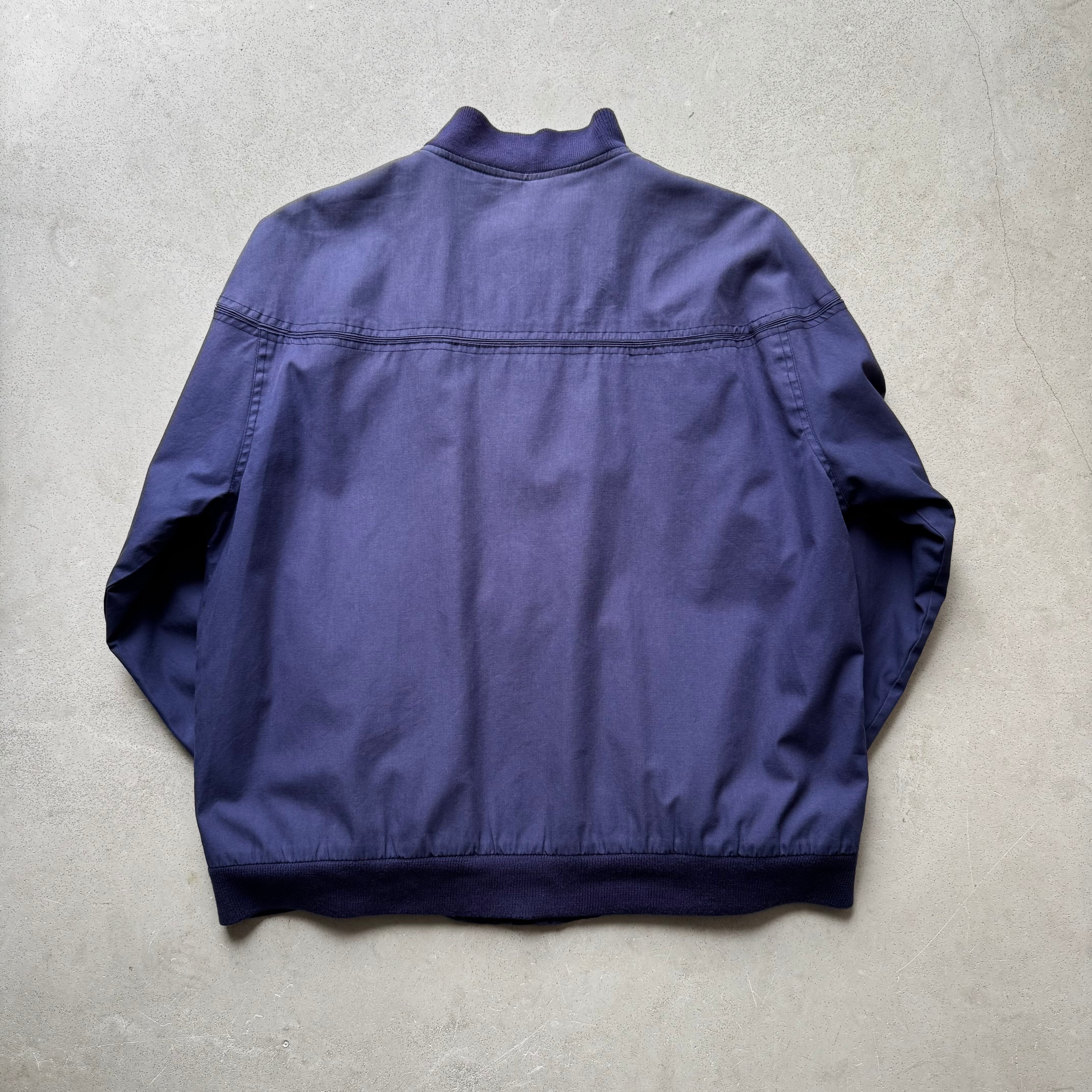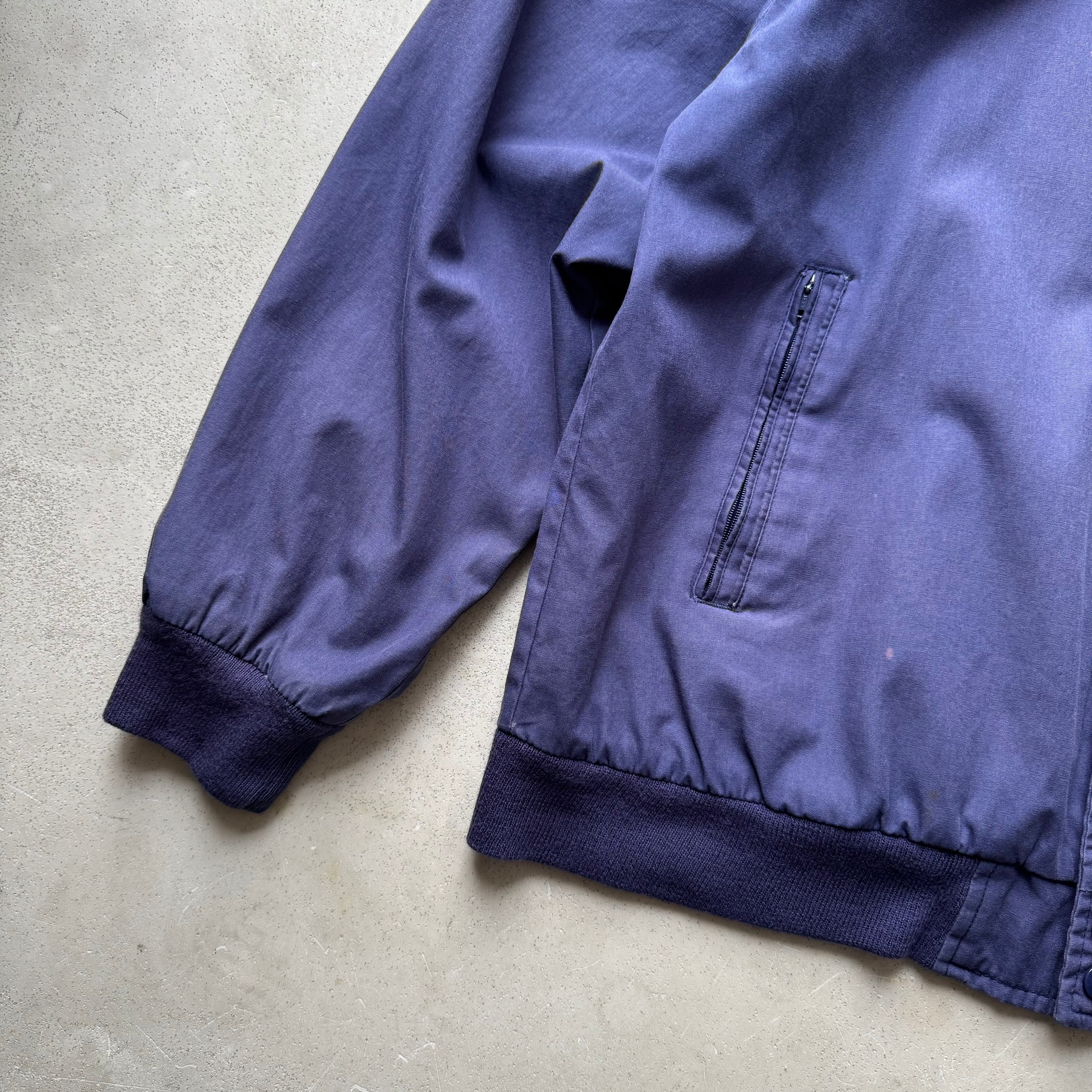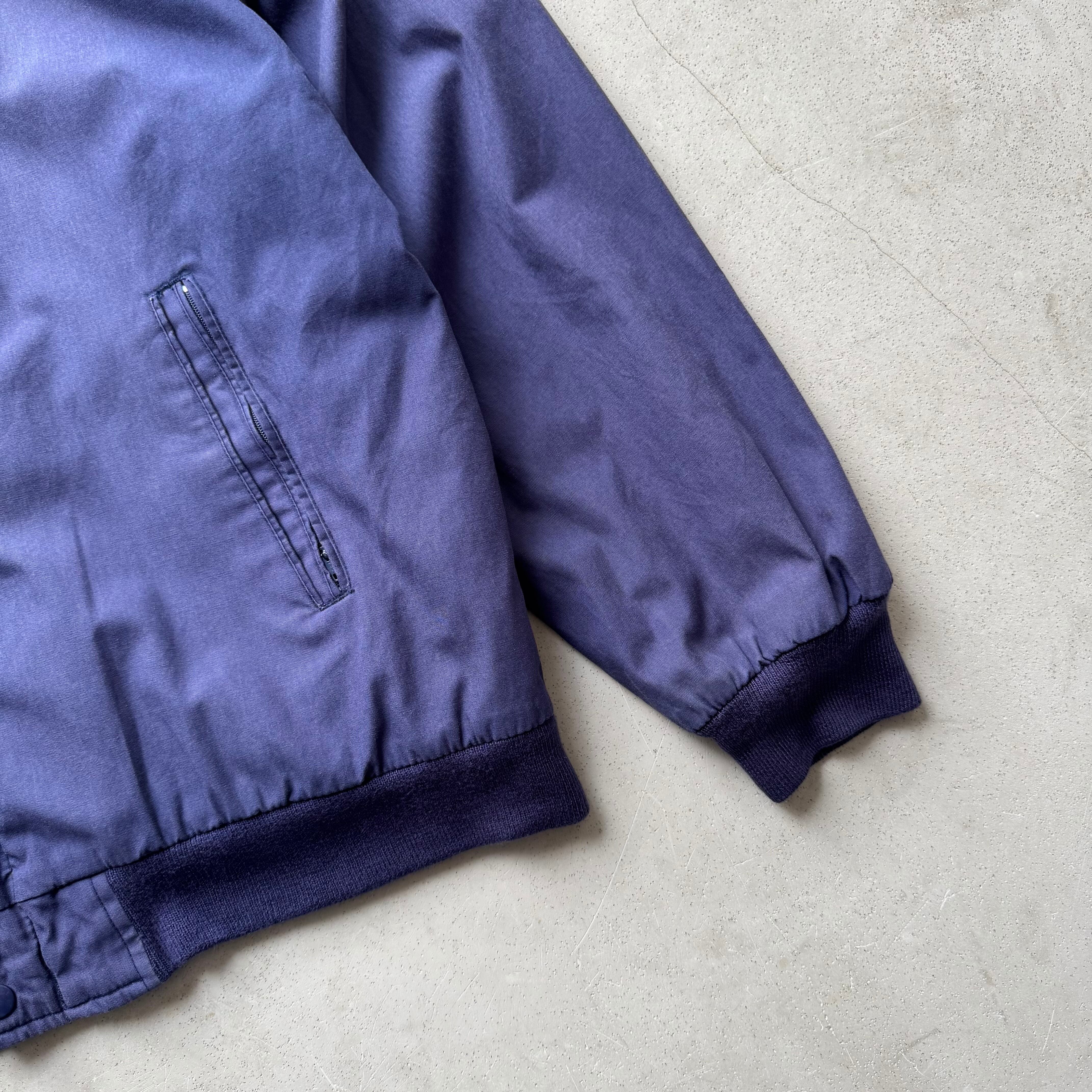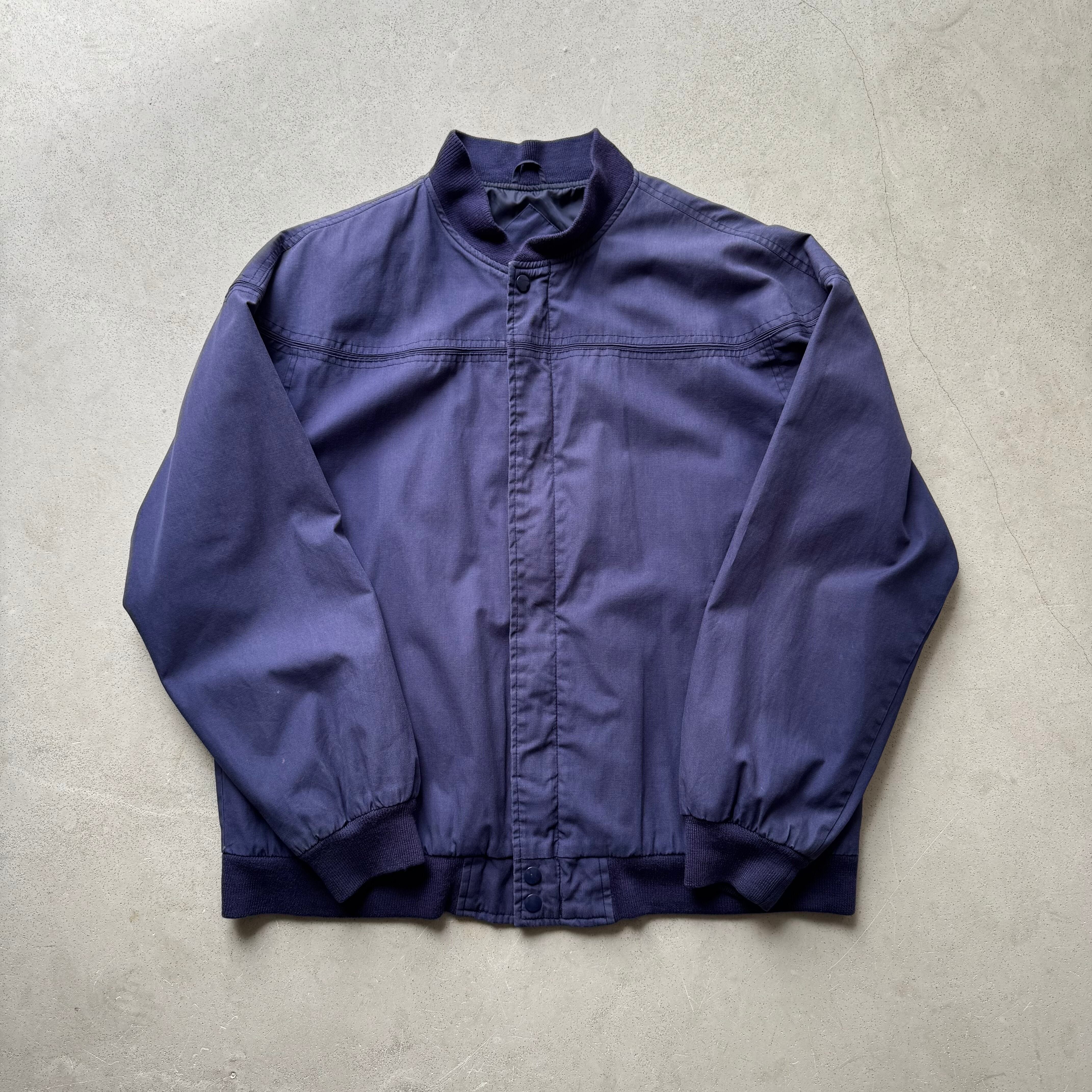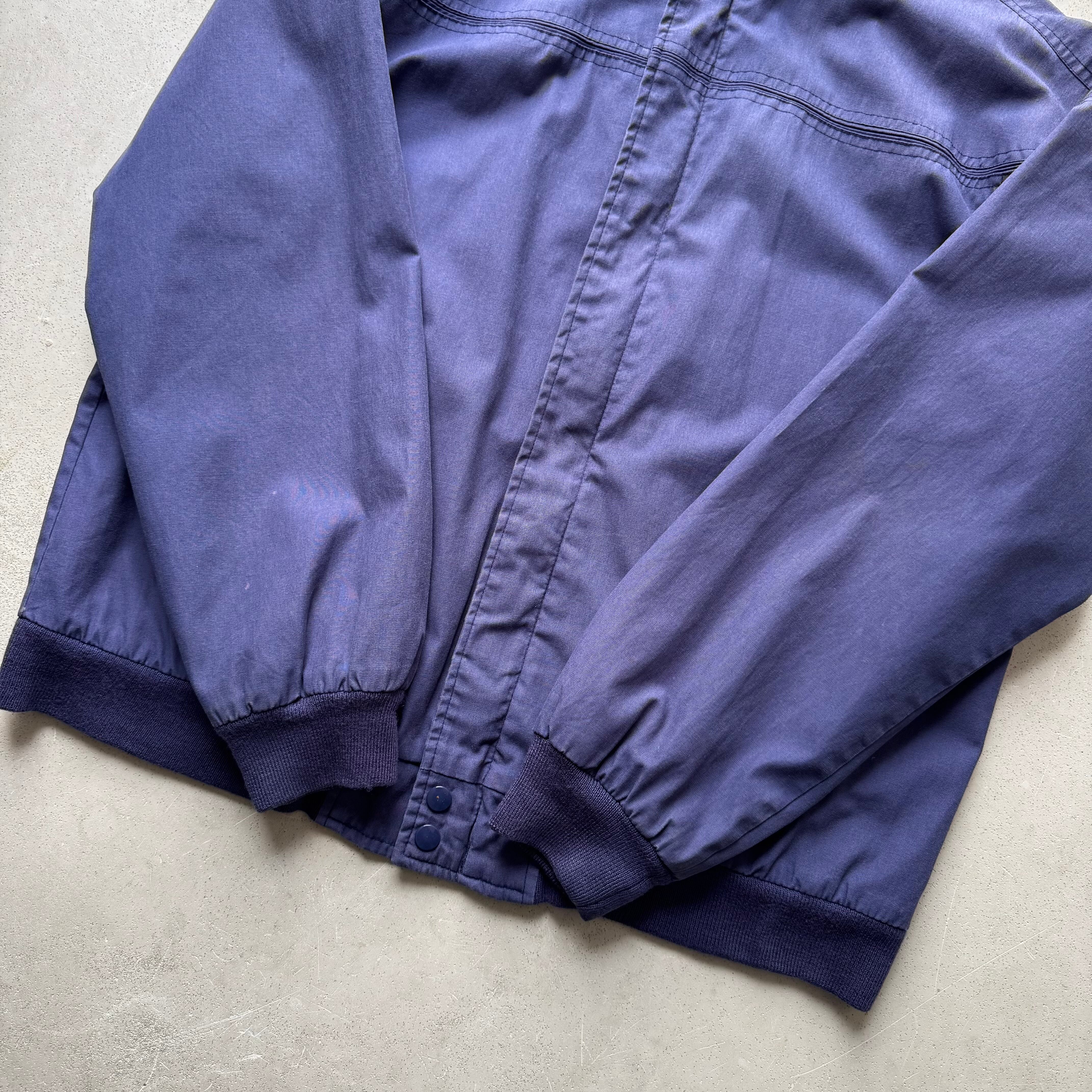 1980's ~ ARNOLD PALMER DERBY JACKET ・ 60%COTTON 40%POLYESTER size:L 実寸:肩幅 63cm / 身幅 63cm / 着丈 67cm / 袖丈 56cm 状態詳細:全体的にフェードしナス紺のような綺麗な色合いの一着です。 フロントボディ、両袖に薄汚れがございます。首元のリブが少し緩んでおります。 その他目立つダメージの見られないGOOD CONDITIONです。 非常におすすめの逸品です この機会に是非ご検討ください